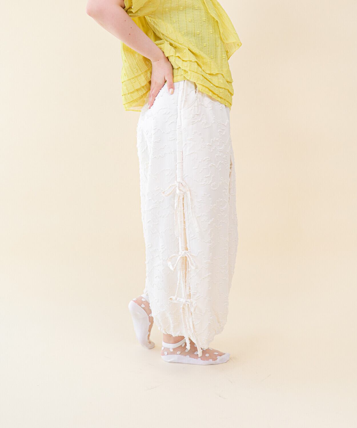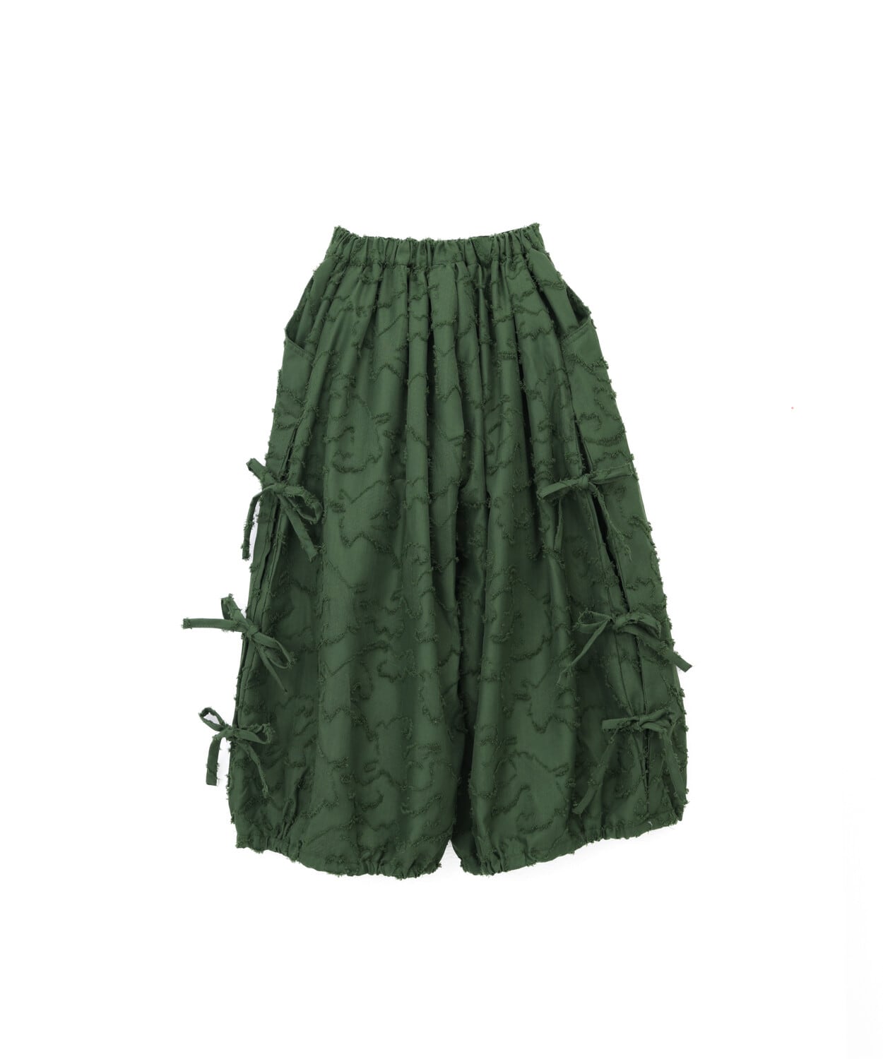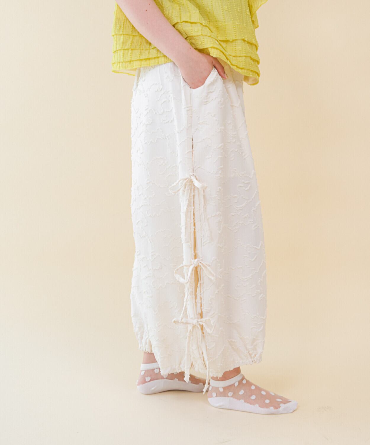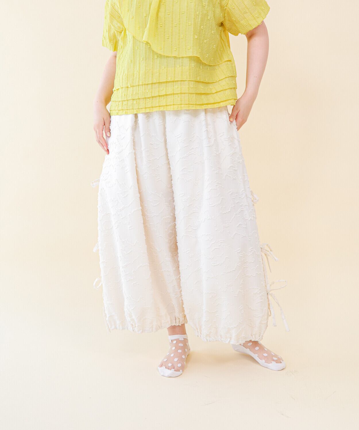 These pants feature a charmingly voluminous silhouette. The vertical ribbon detail adds cuteness even to the sides. The textured fabric is lightweight, quick-drying, and comfortable. Despite the long length, these pants are perfect for staying cool and stylish in hot summer weather.
