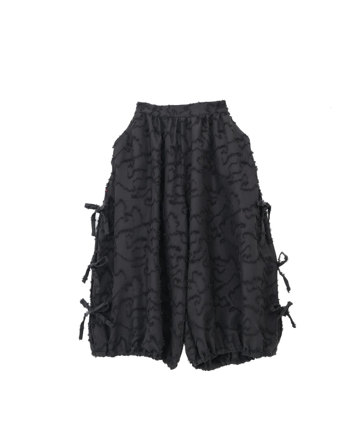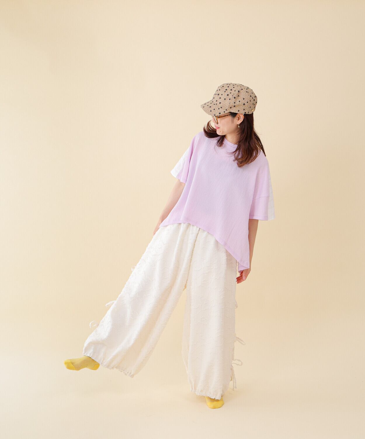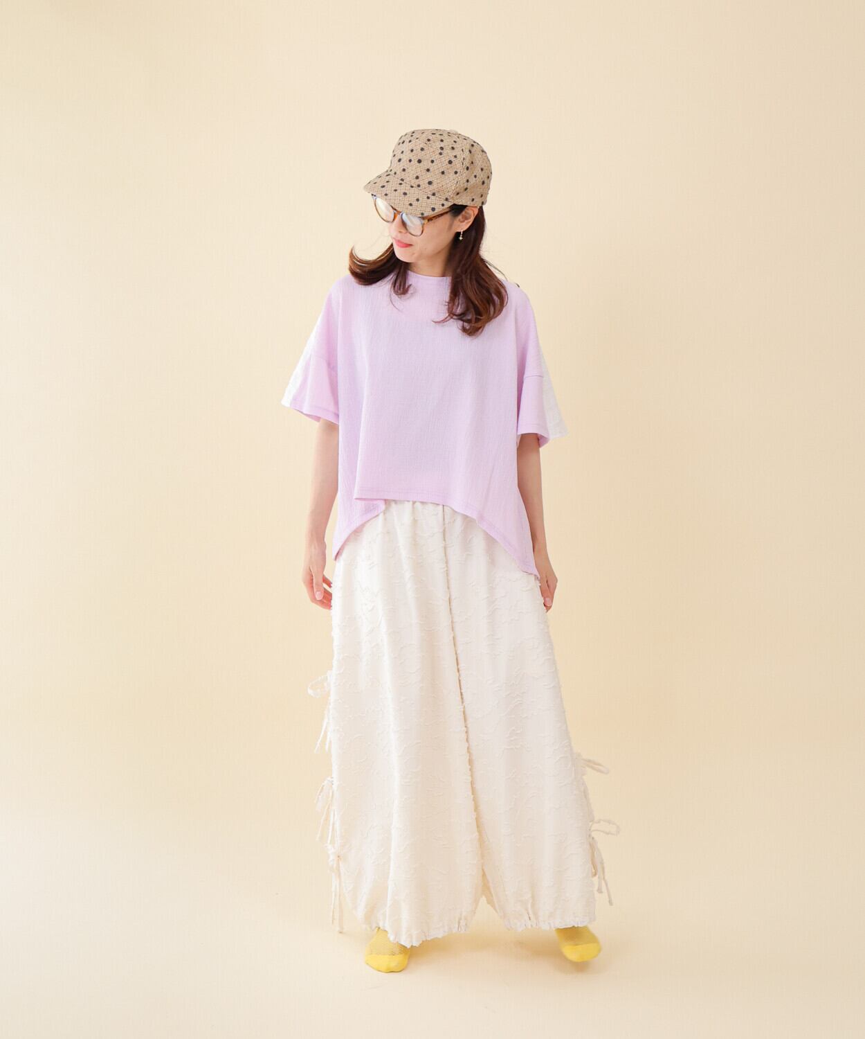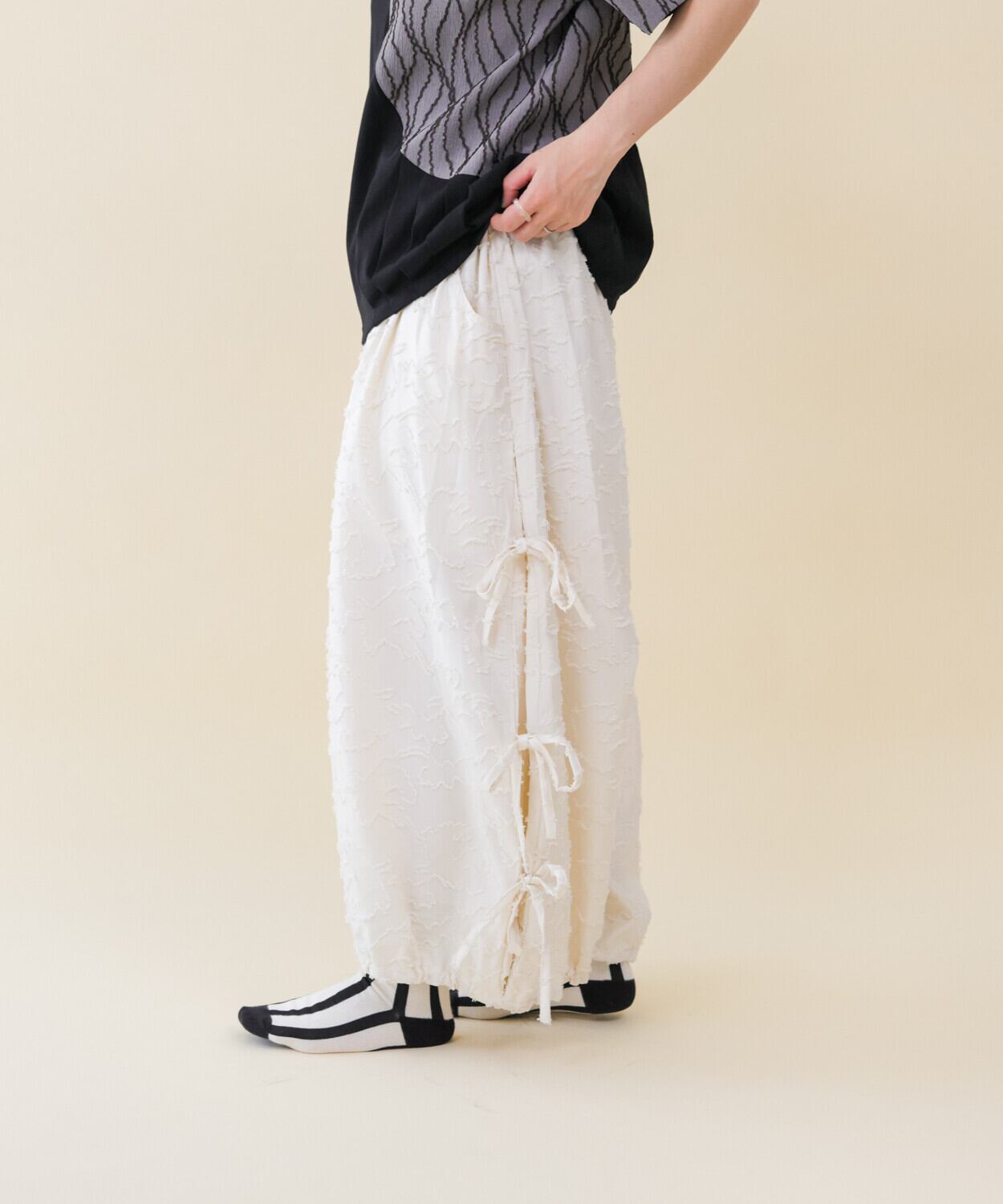 These pants feature a charmingly voluminous silhouette. The vertical ribbon detail adds cuteness even to the sides. The textured fabric is lightweight, quick-drying, and comfortable. Despite the long length, these pants are perfect for staying cool and stylish in hot summer weather.