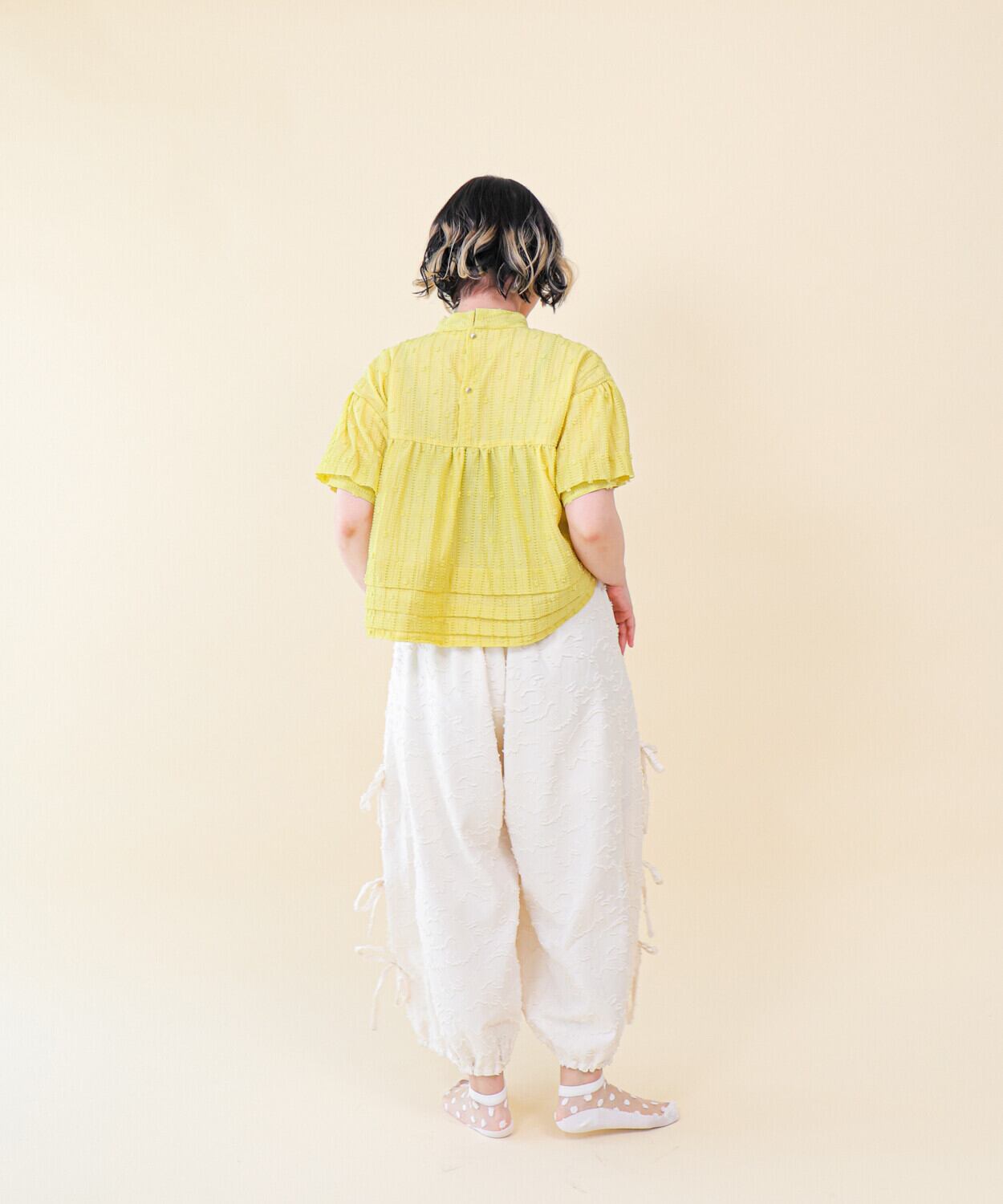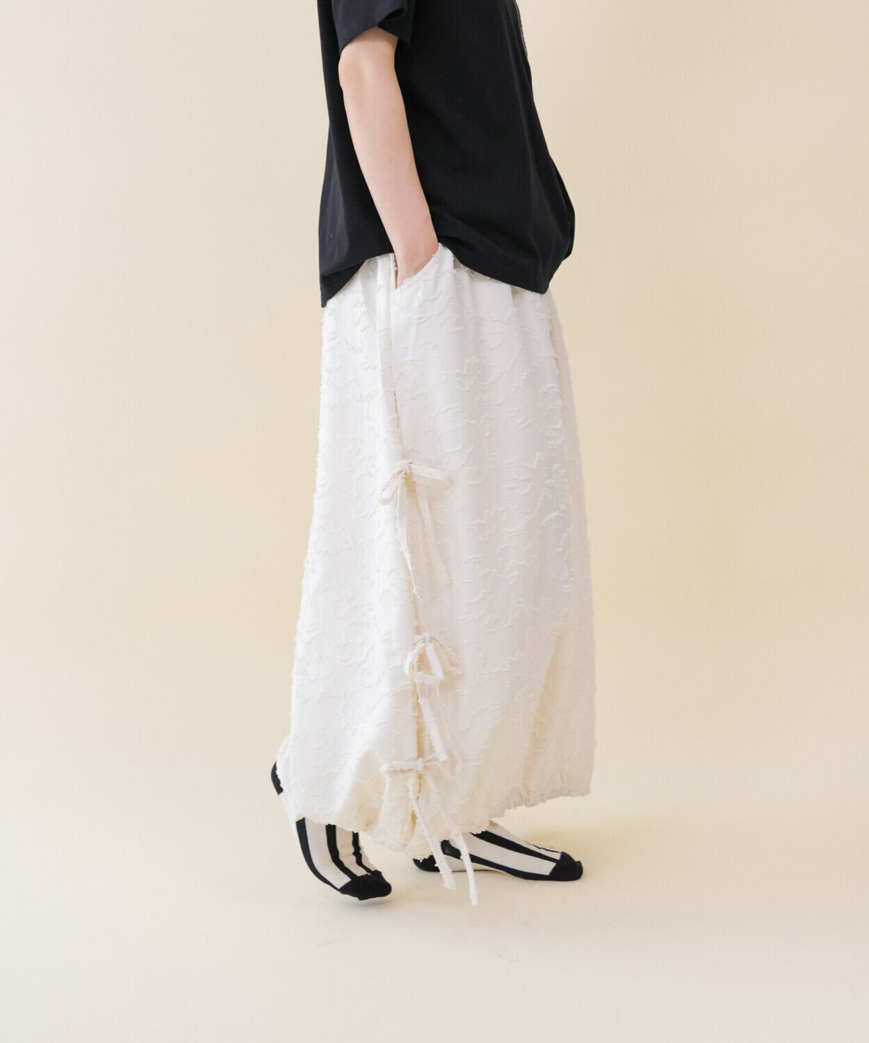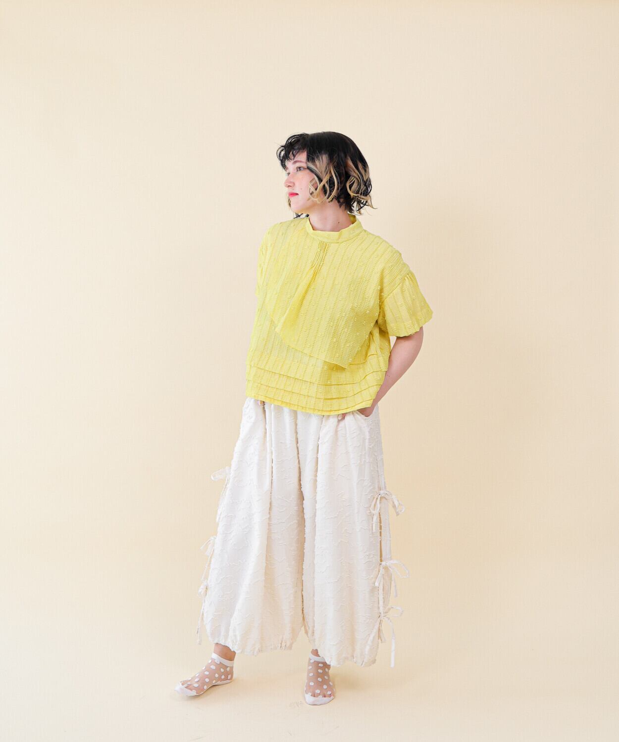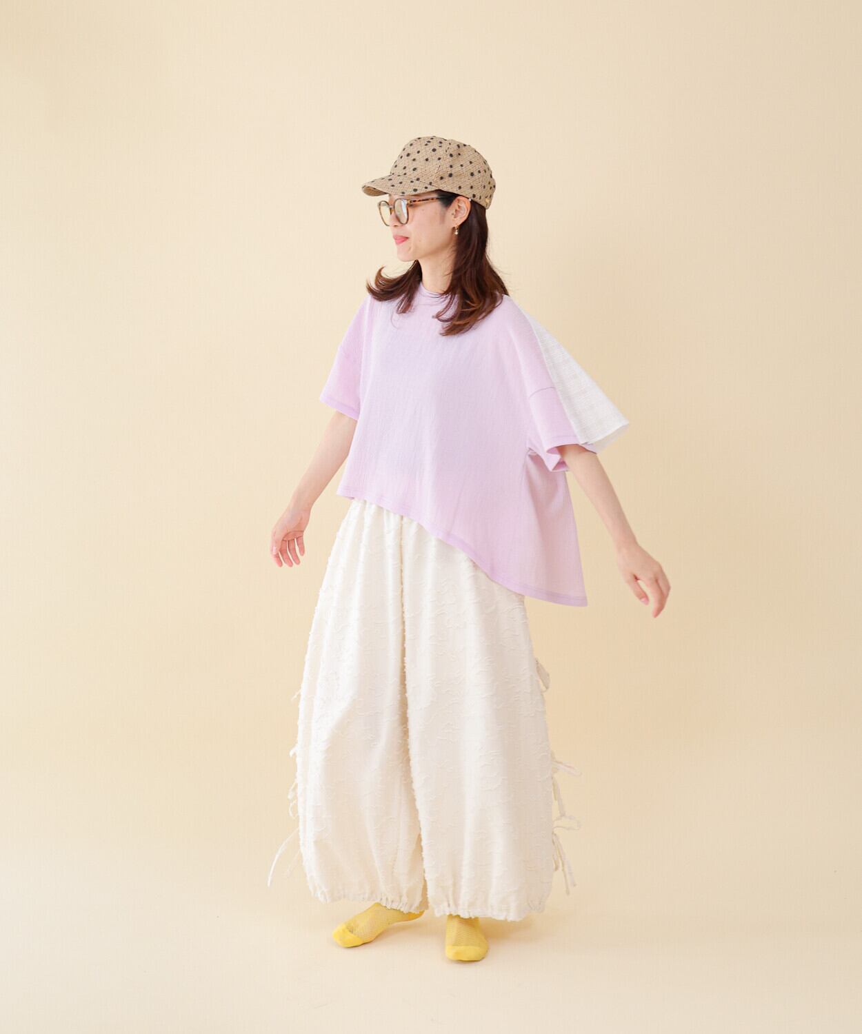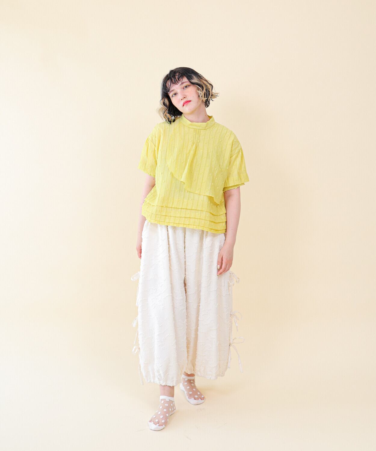 These pants feature a charmingly voluminous silhouette. The vertical ribbon detail adds cuteness even to the sides. The textured fabric is lightweight, quick-drying, and comfortable. Despite the long length, these pants are perfect for staying cool and stylish in hot summer weather.