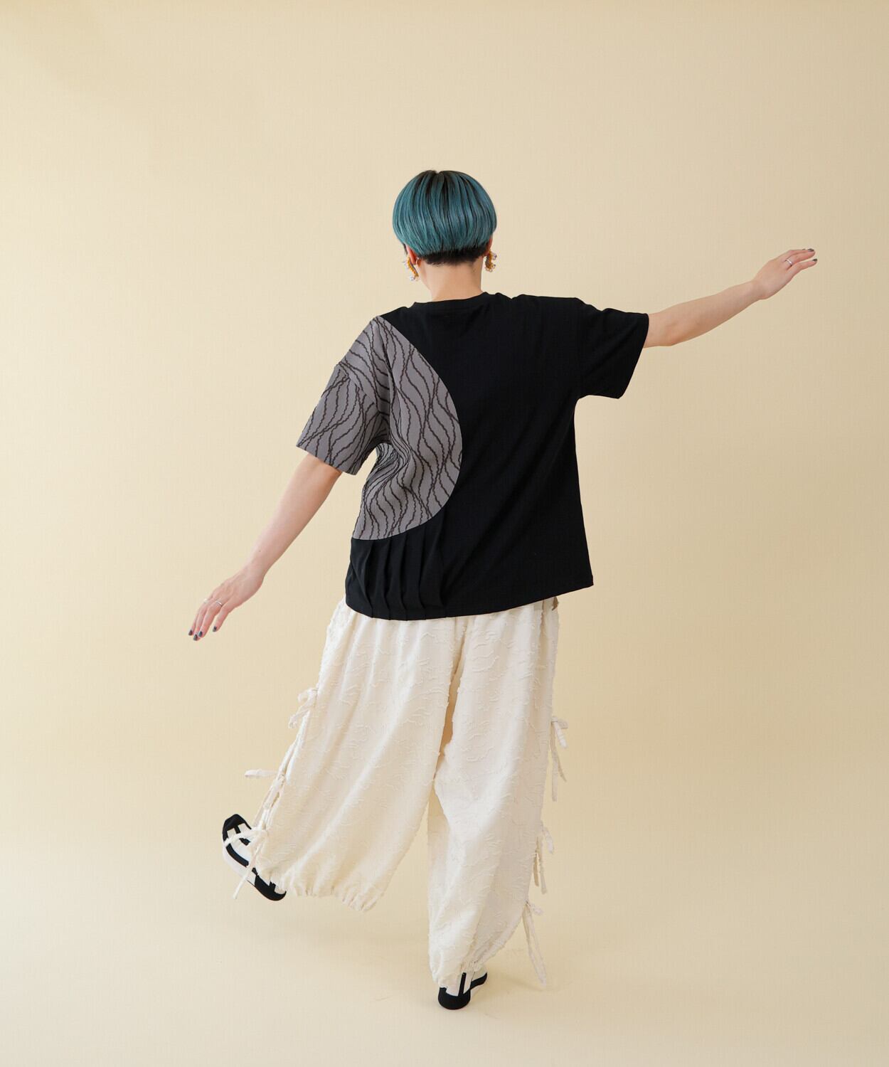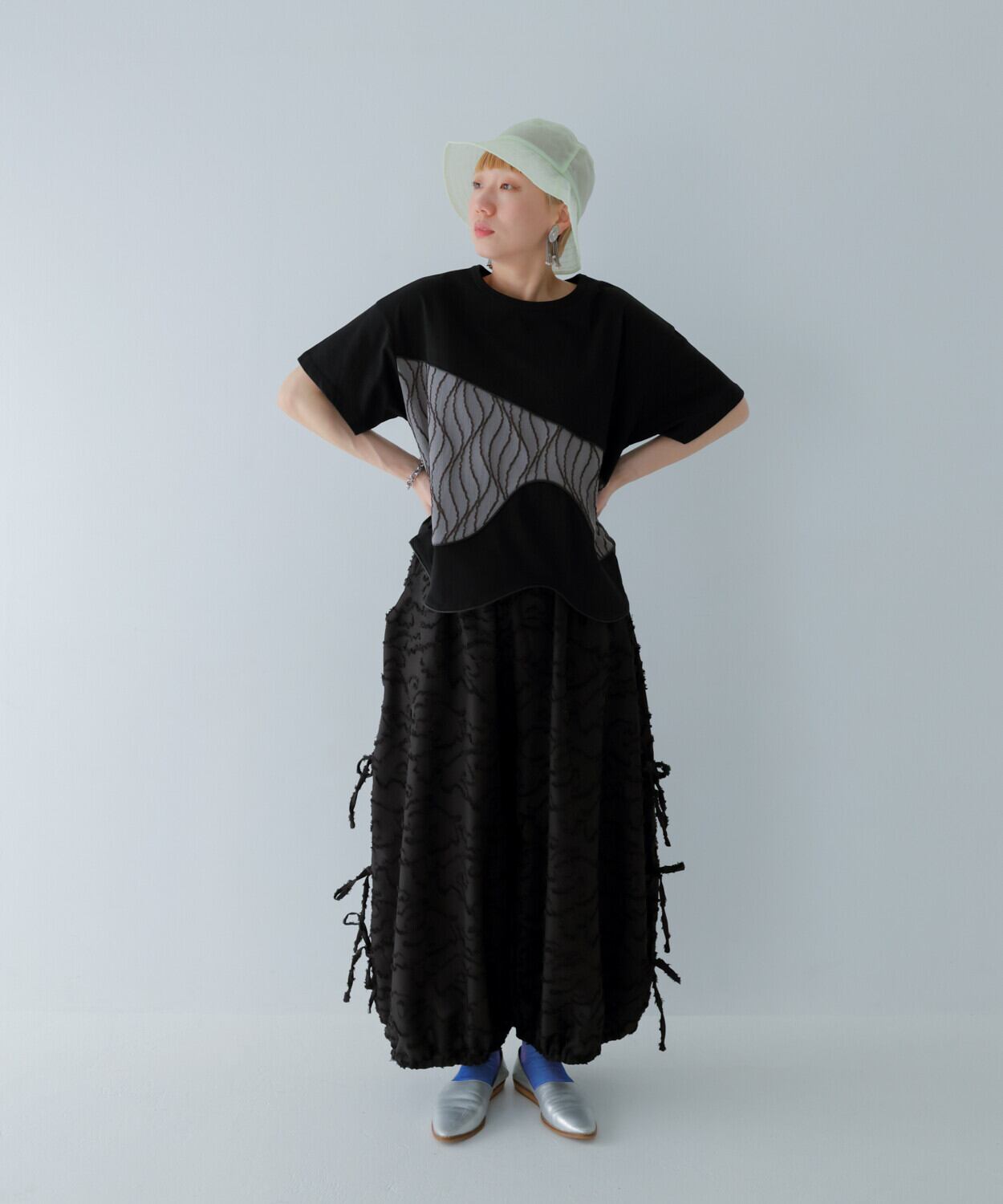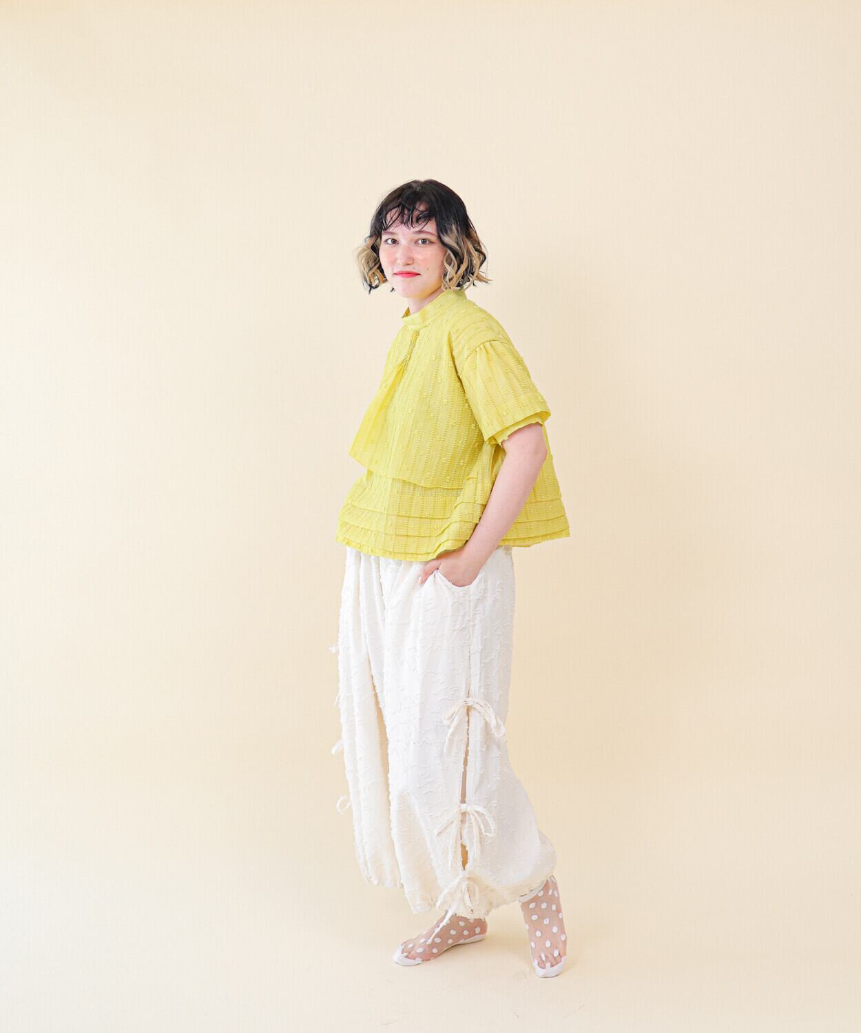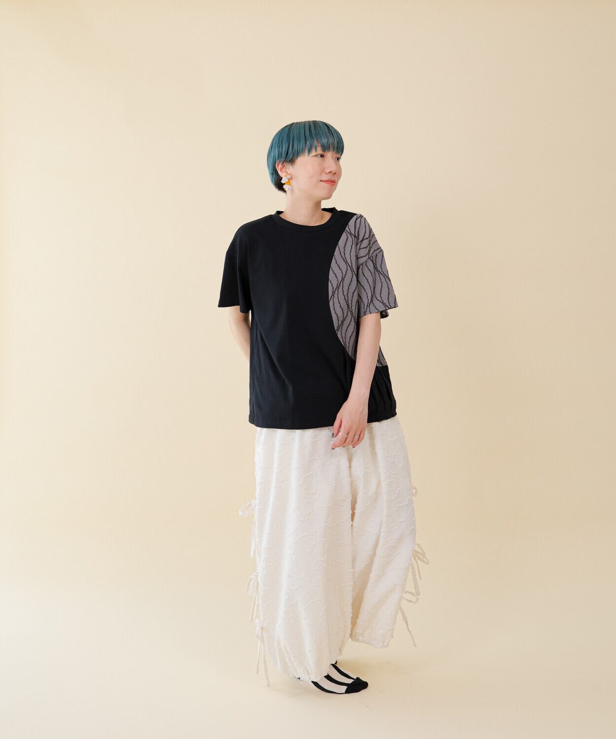 These pants feature a charmingly voluminous silhouette. The vertical ribbon detail adds cuteness even to the sides. The textured fabric is lightweight, quick-drying, and comfortable. Despite the long length, these pants are perfect for staying cool and stylish in hot summer weather.