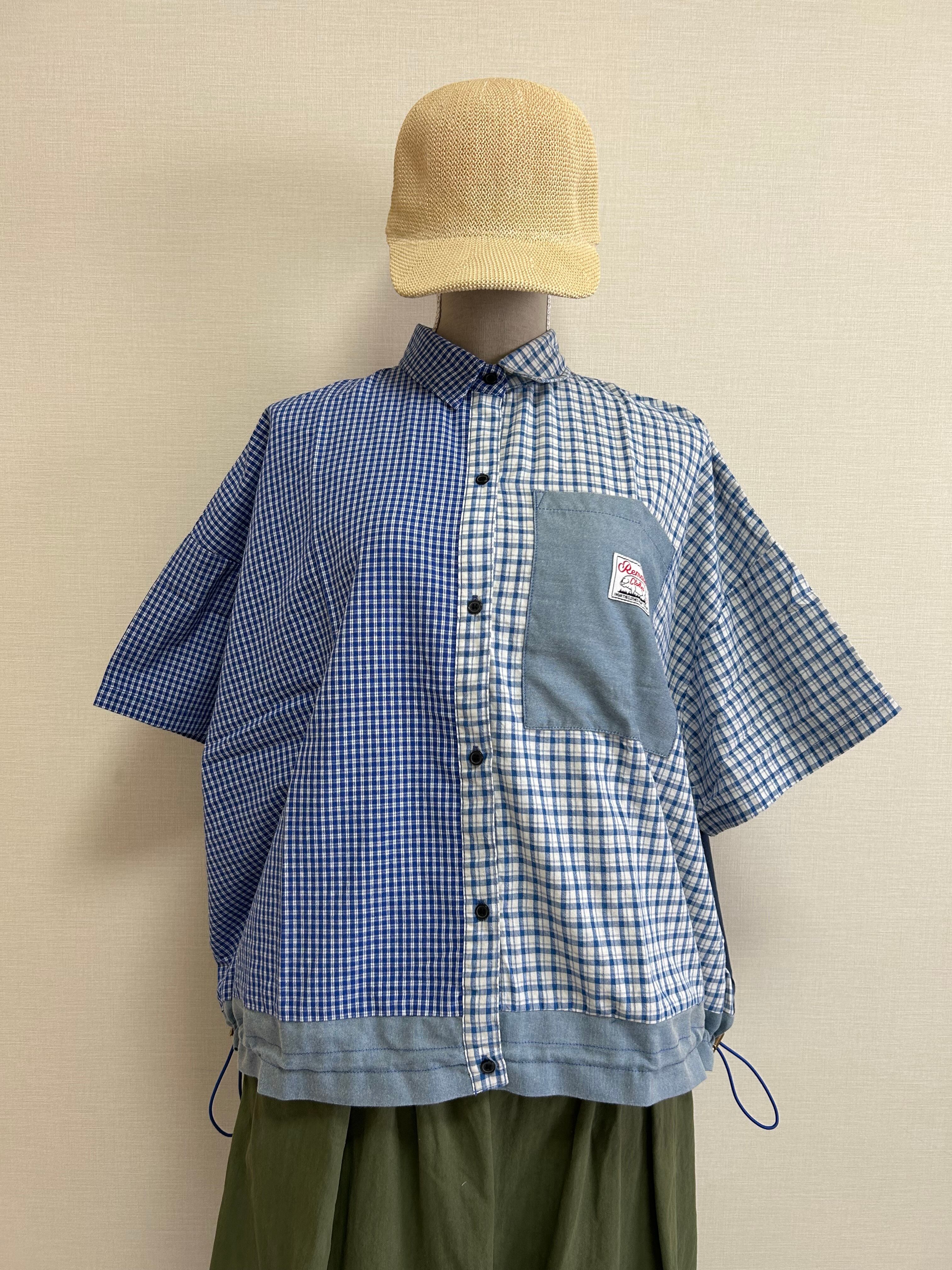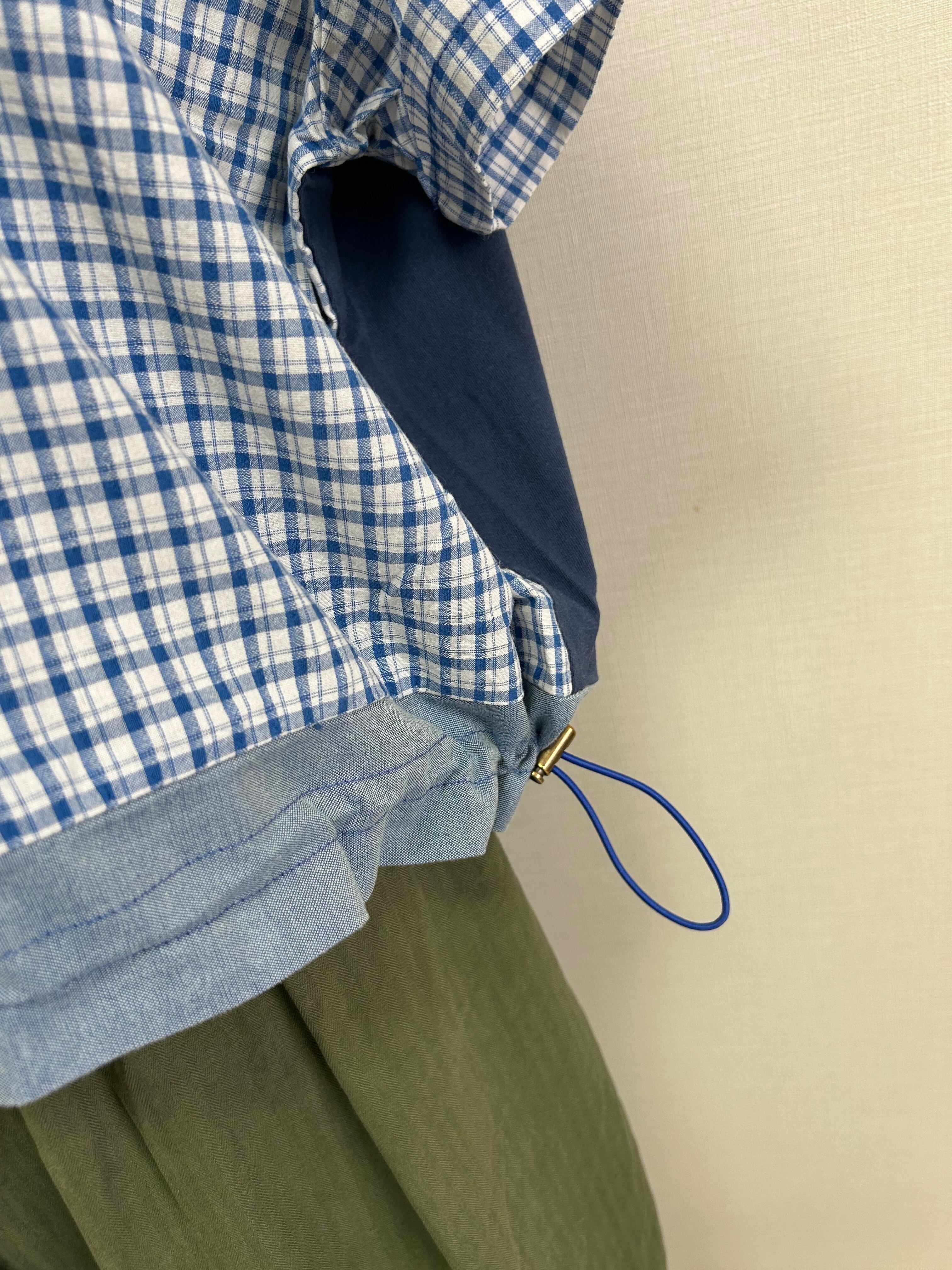 リメイク風に組み合わせた、裾ドロスト付きのリメイクチェックシャツです。