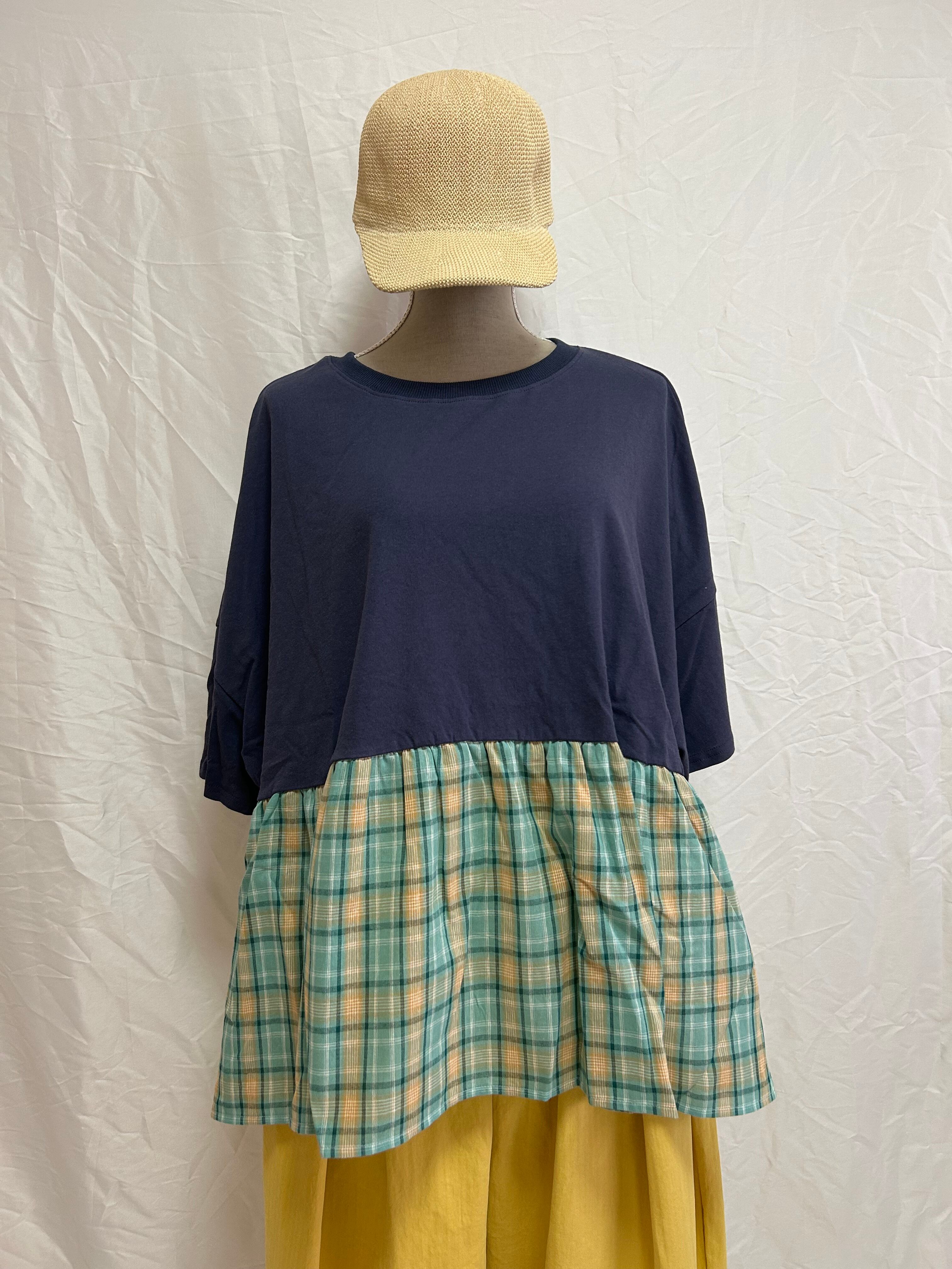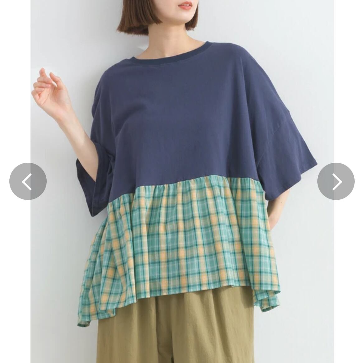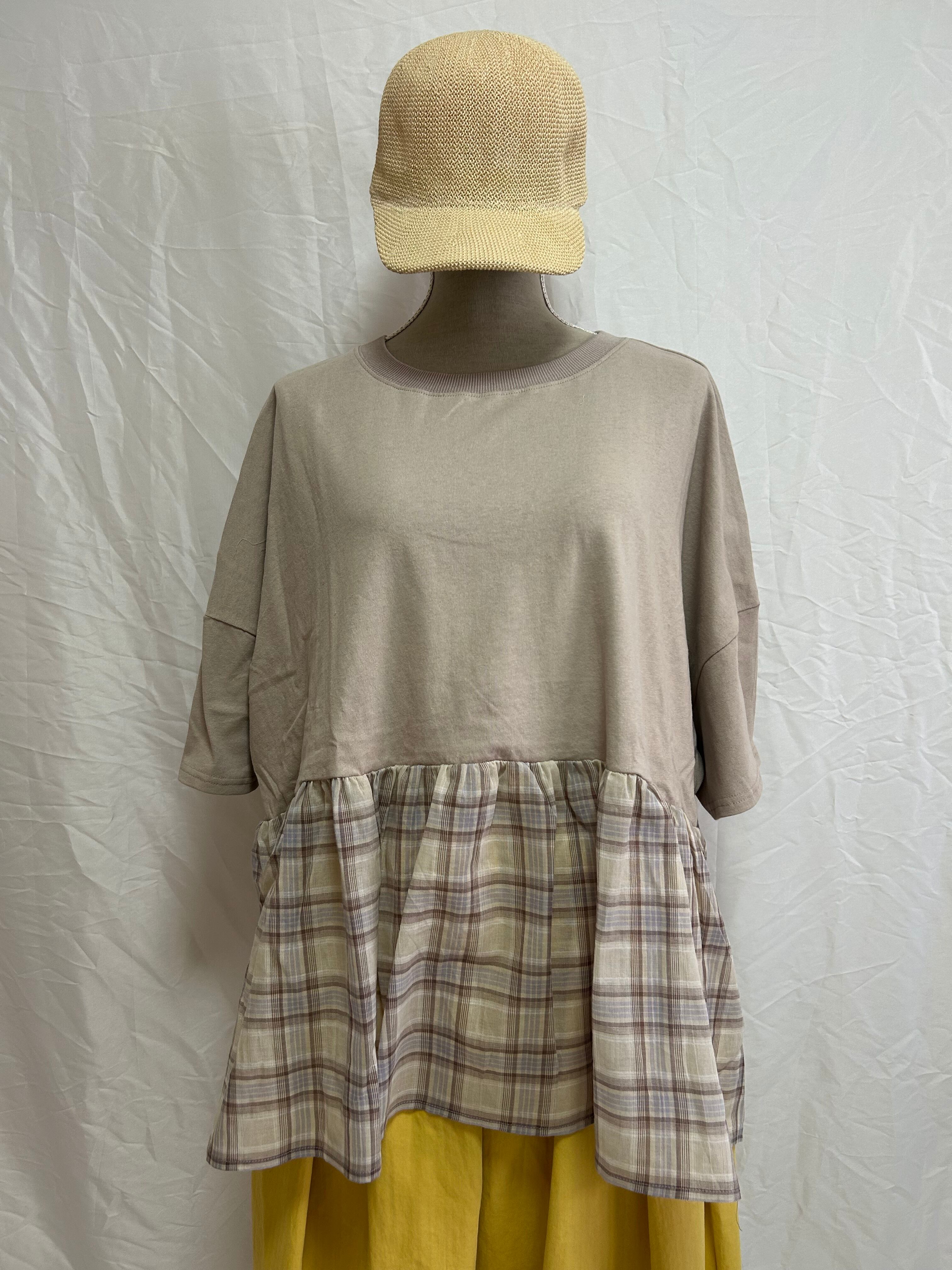 接触冷感 / ドッキングTシャツ / チェック切替 / 異素材MIX / プルオーバー / 天竺カットソー / ギャザー切替 / 夏トップス / 涼感素材 / 涼しいTシャツ / ナチュラルカジュアル / レディース半袖 / ゆったりシルエット / カットソートップス / 大人カジュアル