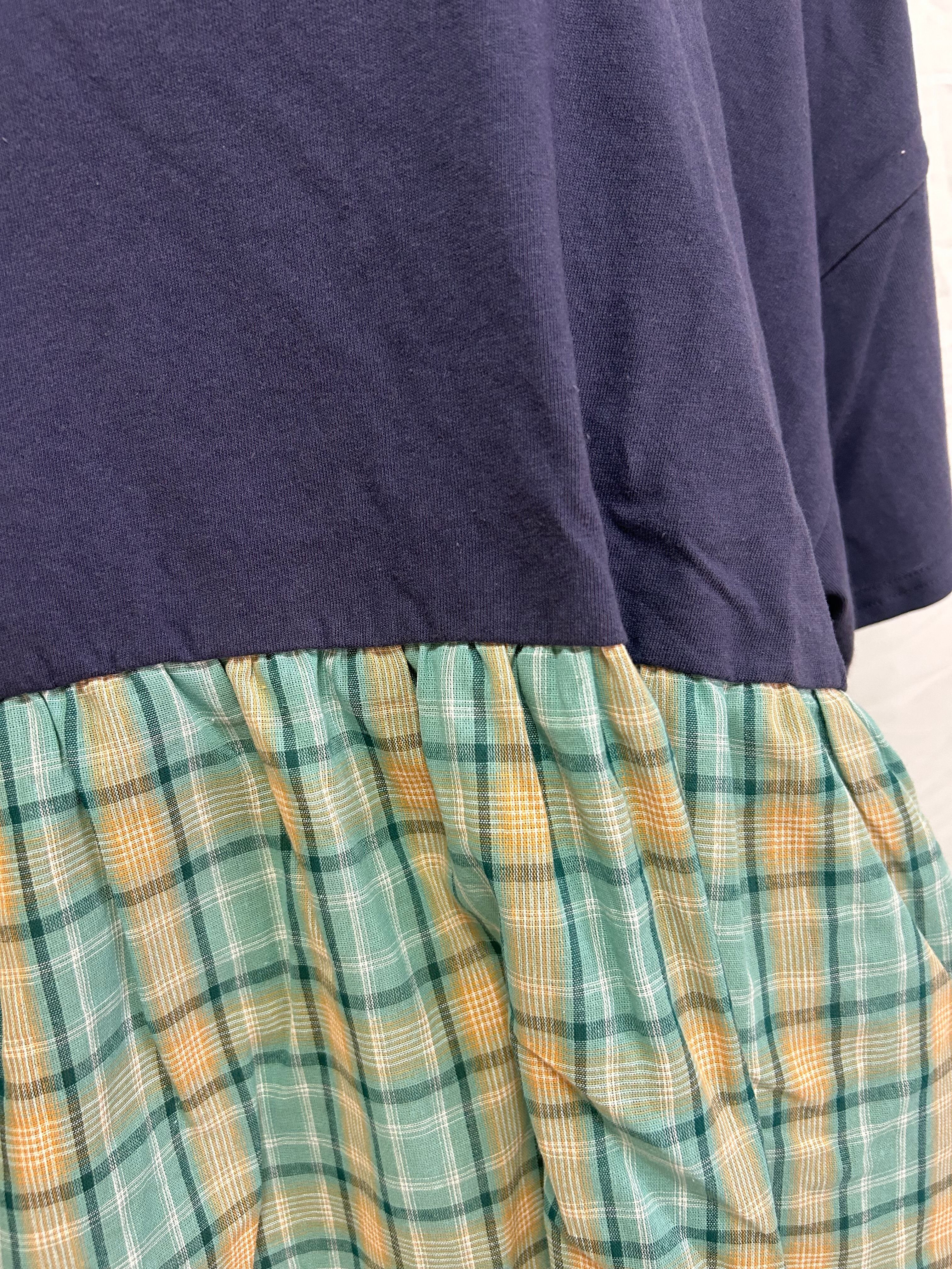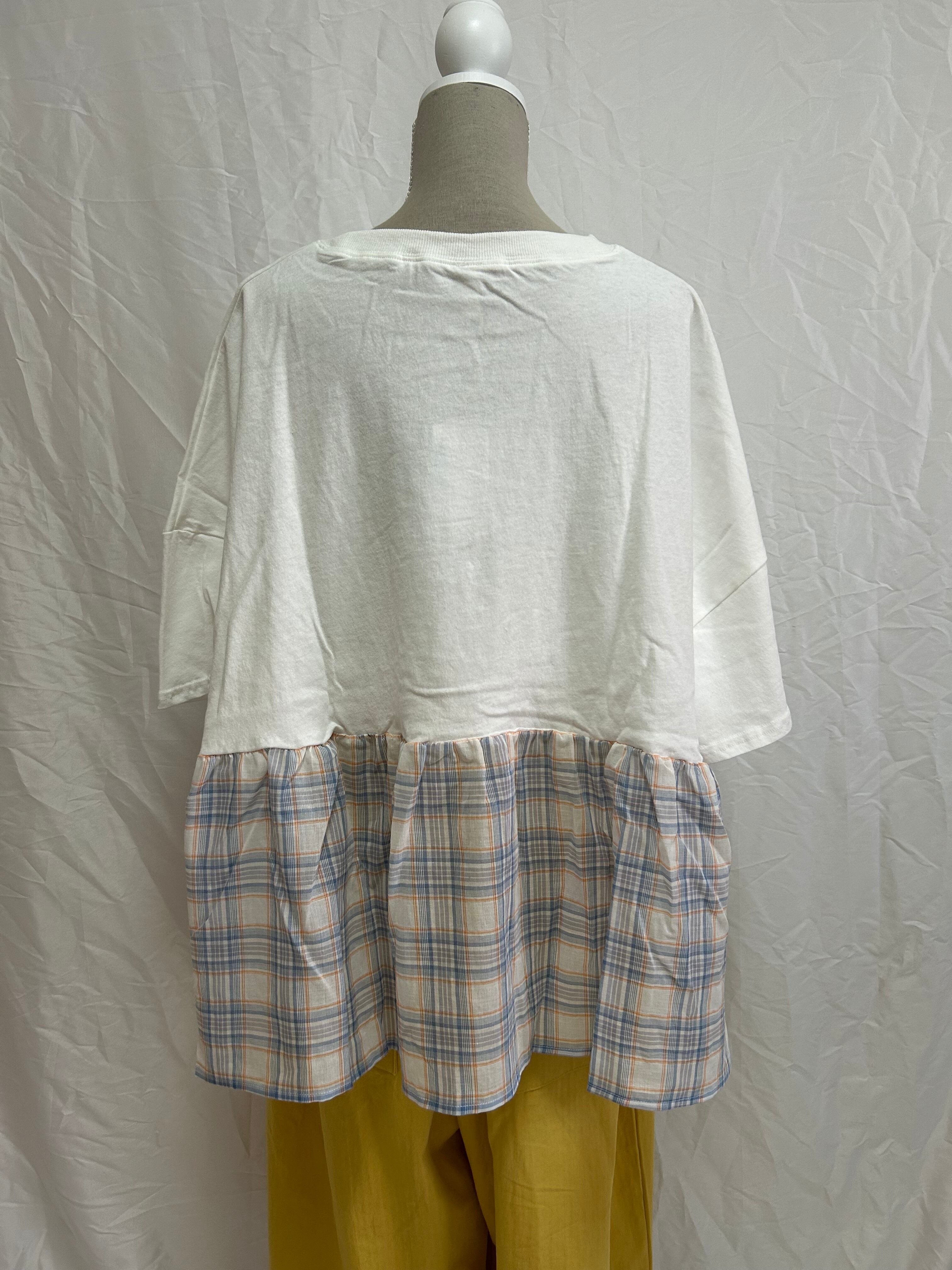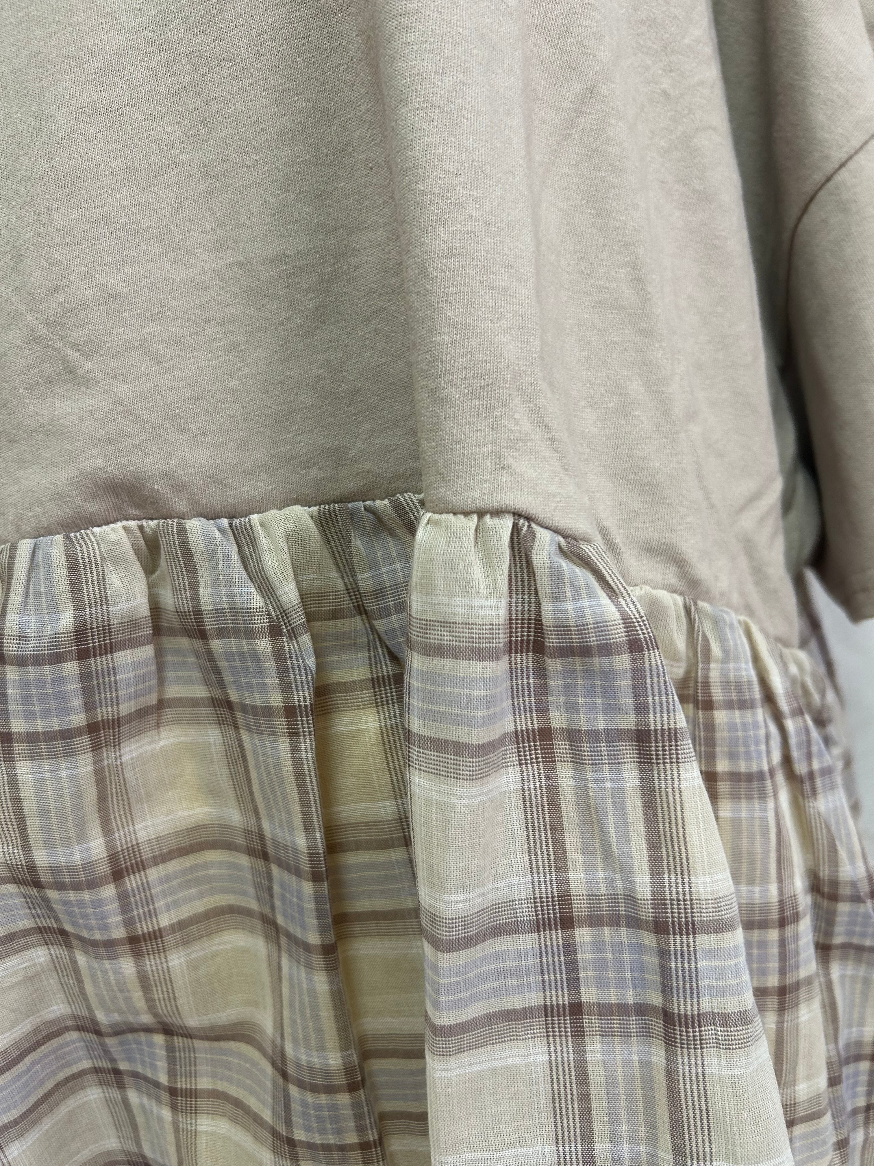 接触冷感 / ドッキングTシャツ / チェック切替 / 異素材MIX / プルオーバー / 天竺カットソー / ギャザー切替 / 夏トップス / 涼感素材 / 涼しいTシャツ / ナチュラルカジュアル / レディース半袖 / ゆったりシルエット / カットソートップス / 大人カジュアル