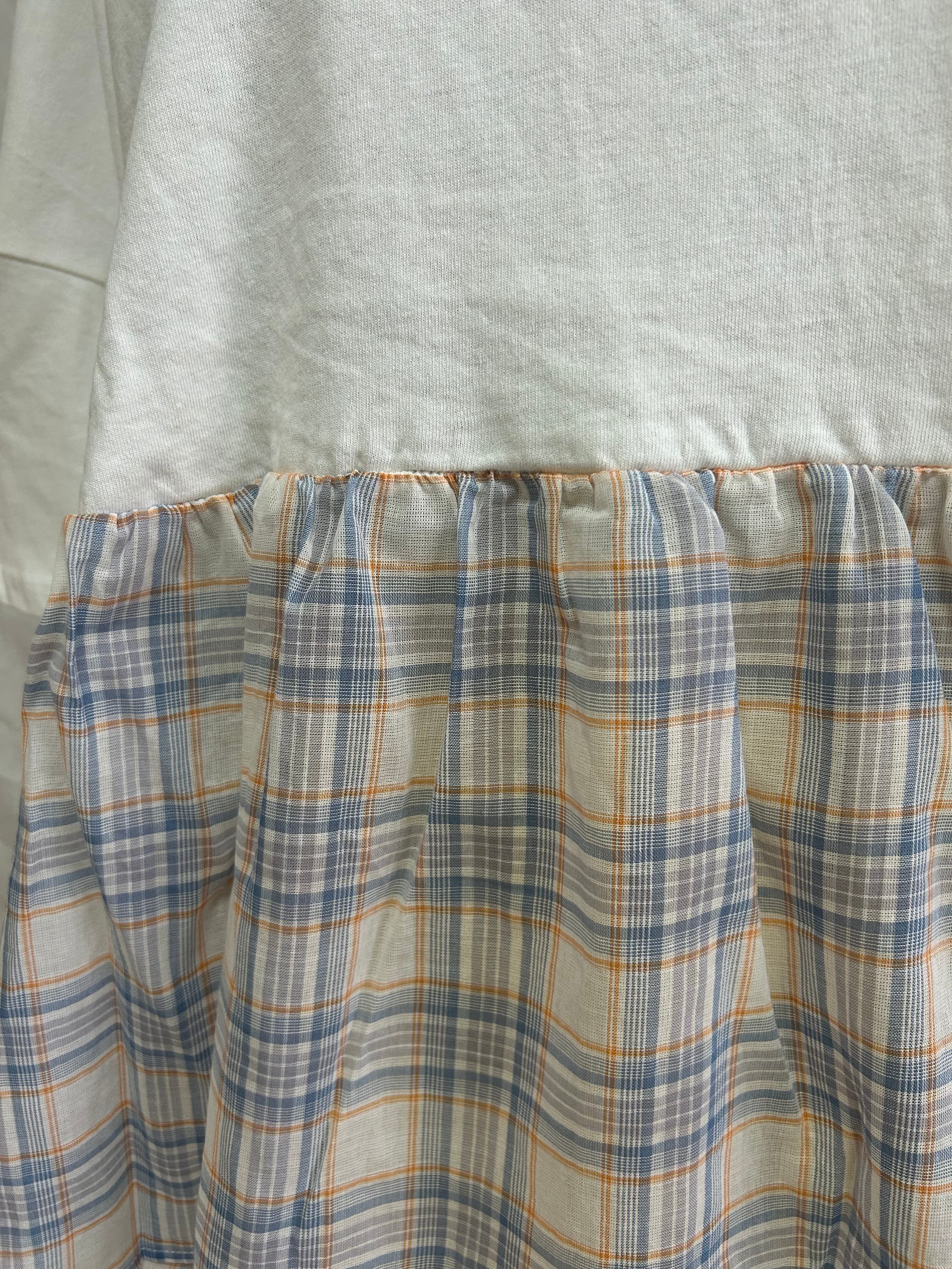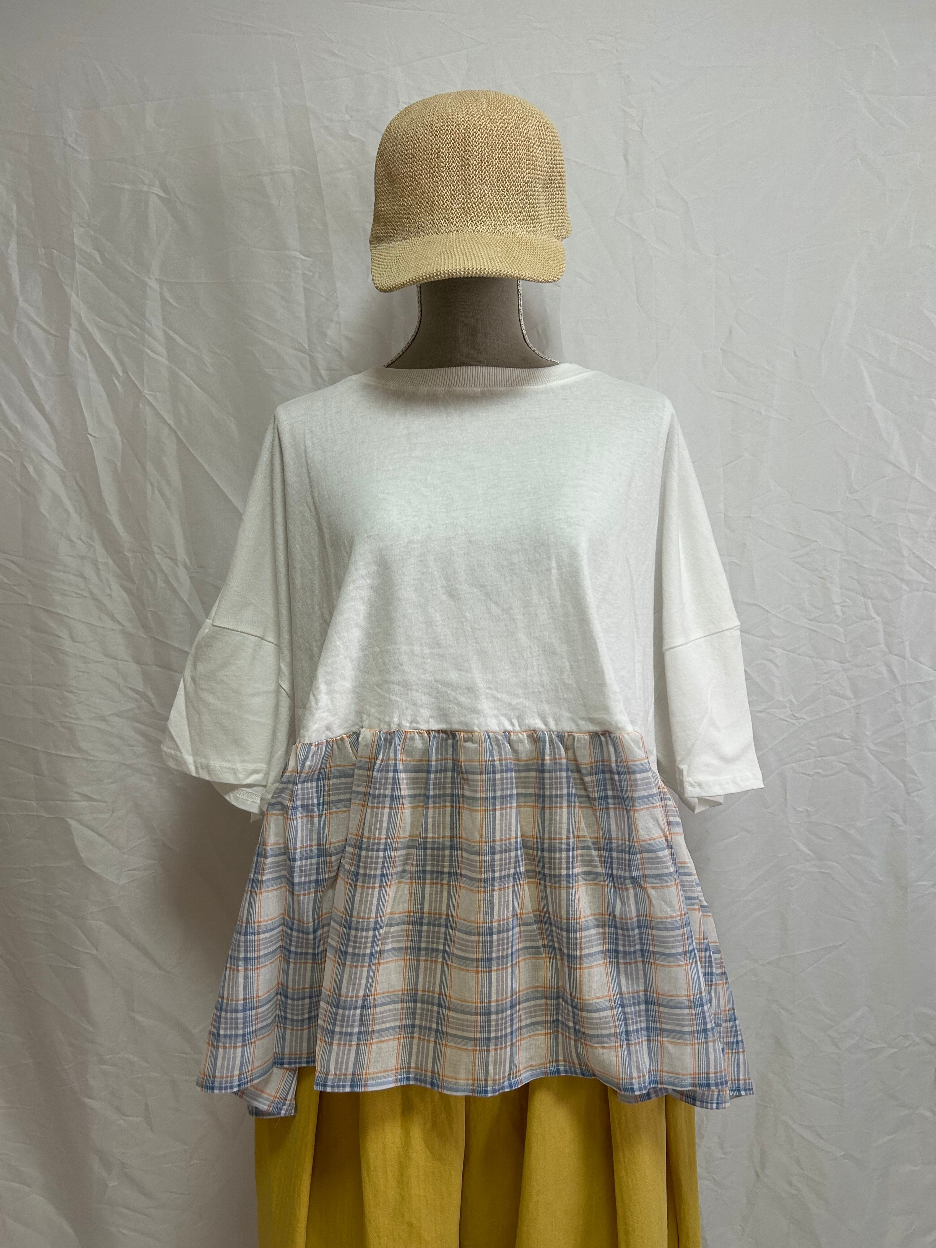 接触冷感×ギャザーチェックの異素材コンビで夏らしさ満点のドッキングTシャツ。