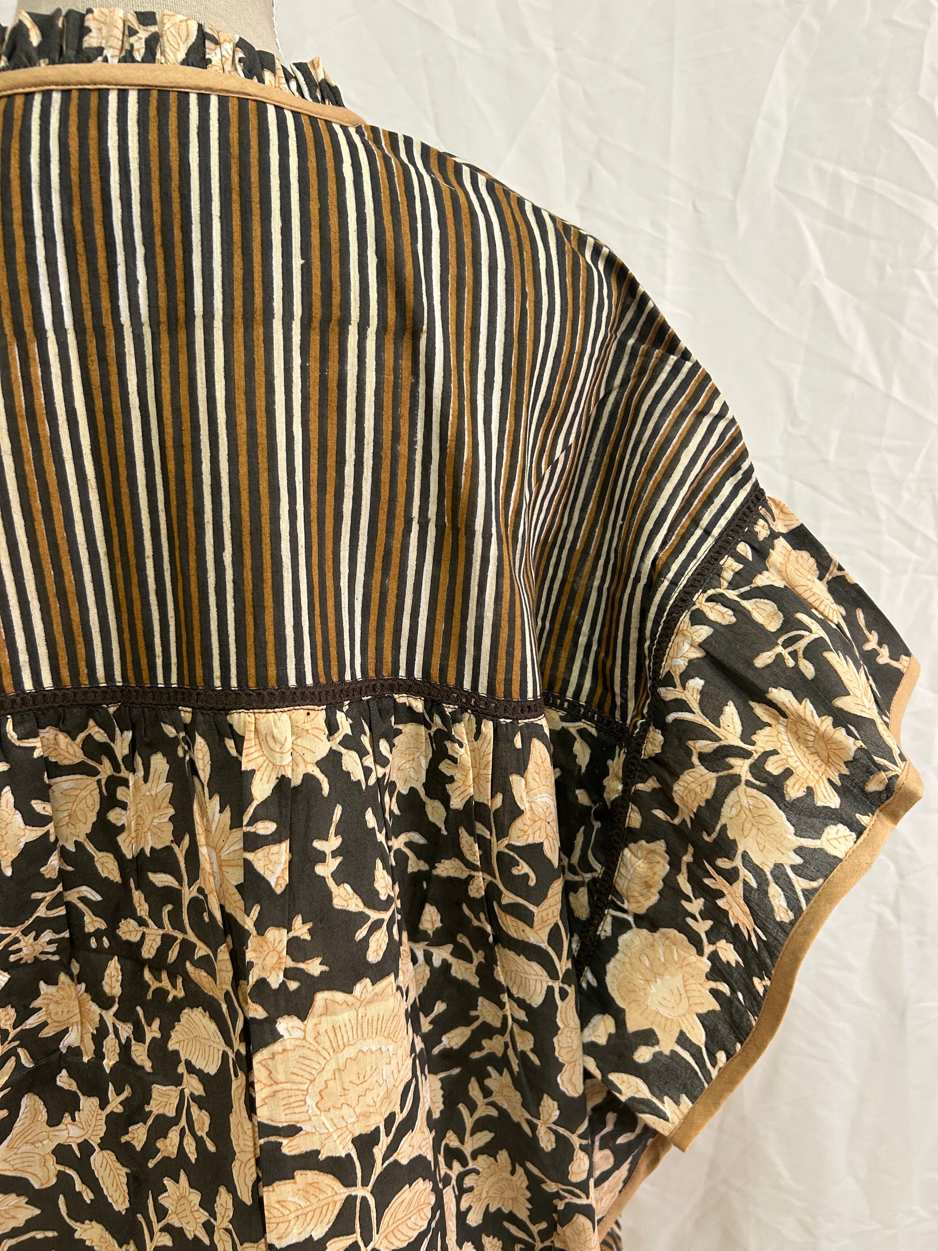 ブロックプリント / インド綿 / フリルブラウス / ハシゴレース / 花柄 / ストライプ / ナチュラルファッション / フレアスリーブ / エスニックテイスト / 民族調 / ハンドプリント / ボイル生地 / 春夏トップス / 涼しいブラウス / パネル切替 / レディーストップス