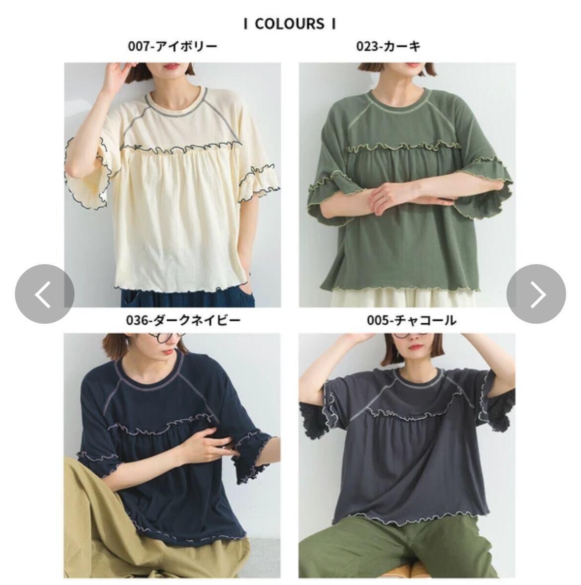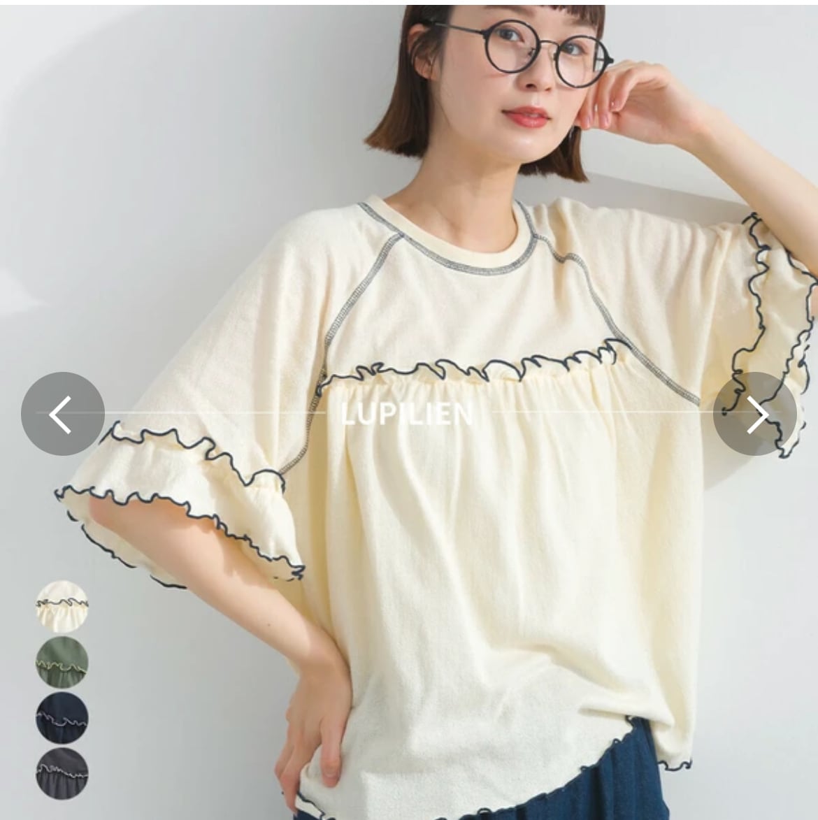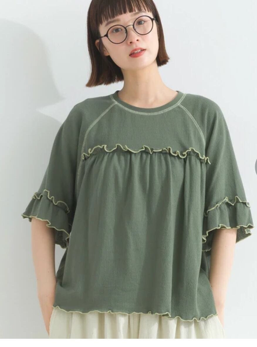 フリルTシャツ / 配色メロウ / ラグランスリーブ / 接触冷感 / カットソー / 夏素材 / 涼感トップス / フェミニンカジュアル / ナチュラルコーデ / ティアード風 / 綿100% / LUPILIEN / レディース / 夏Tシャツ