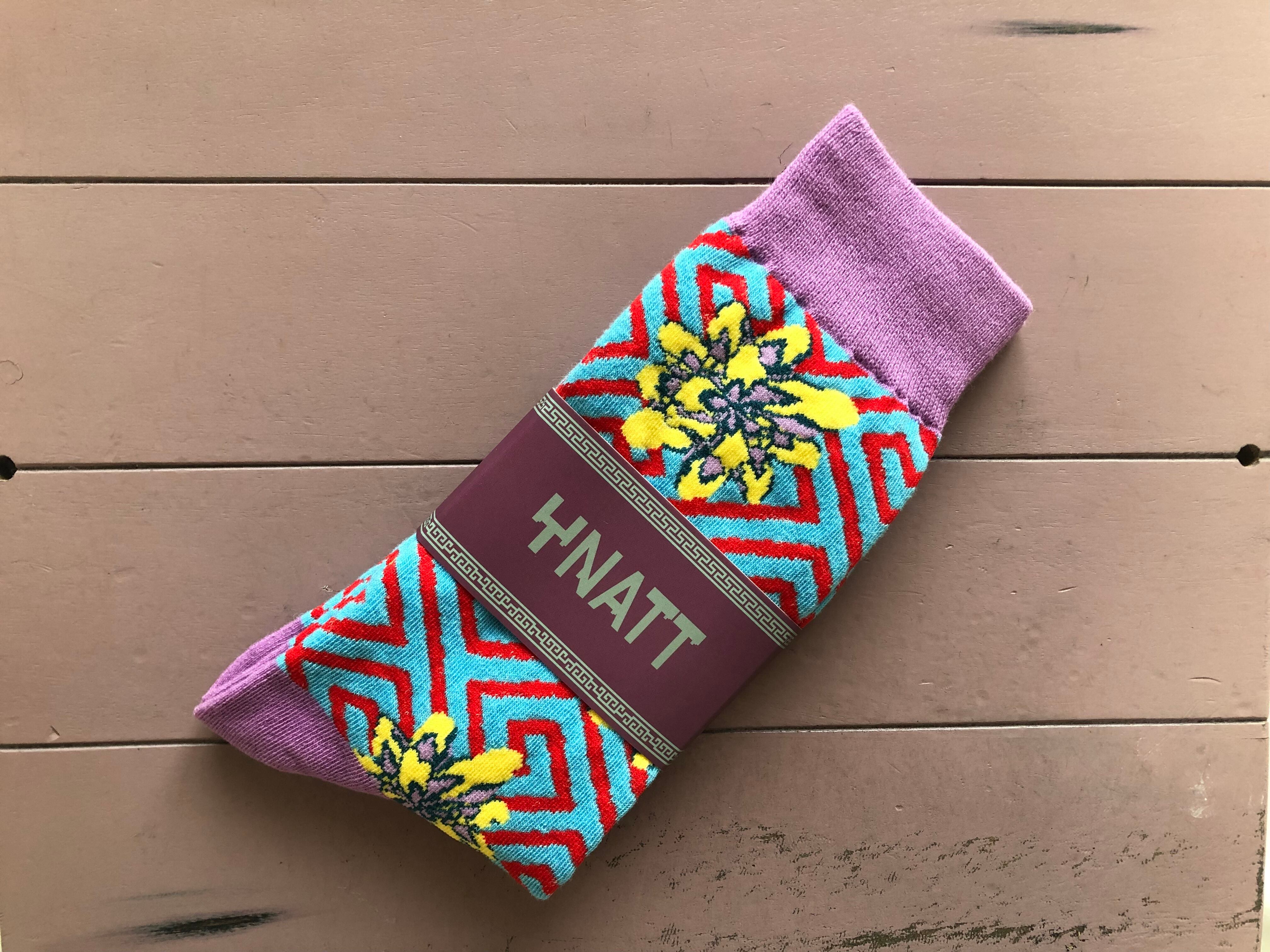 ライトパープルに少し変わった黄色い花、水色ベースに赤い格子文様をあしらったとてもキュートな靴下。