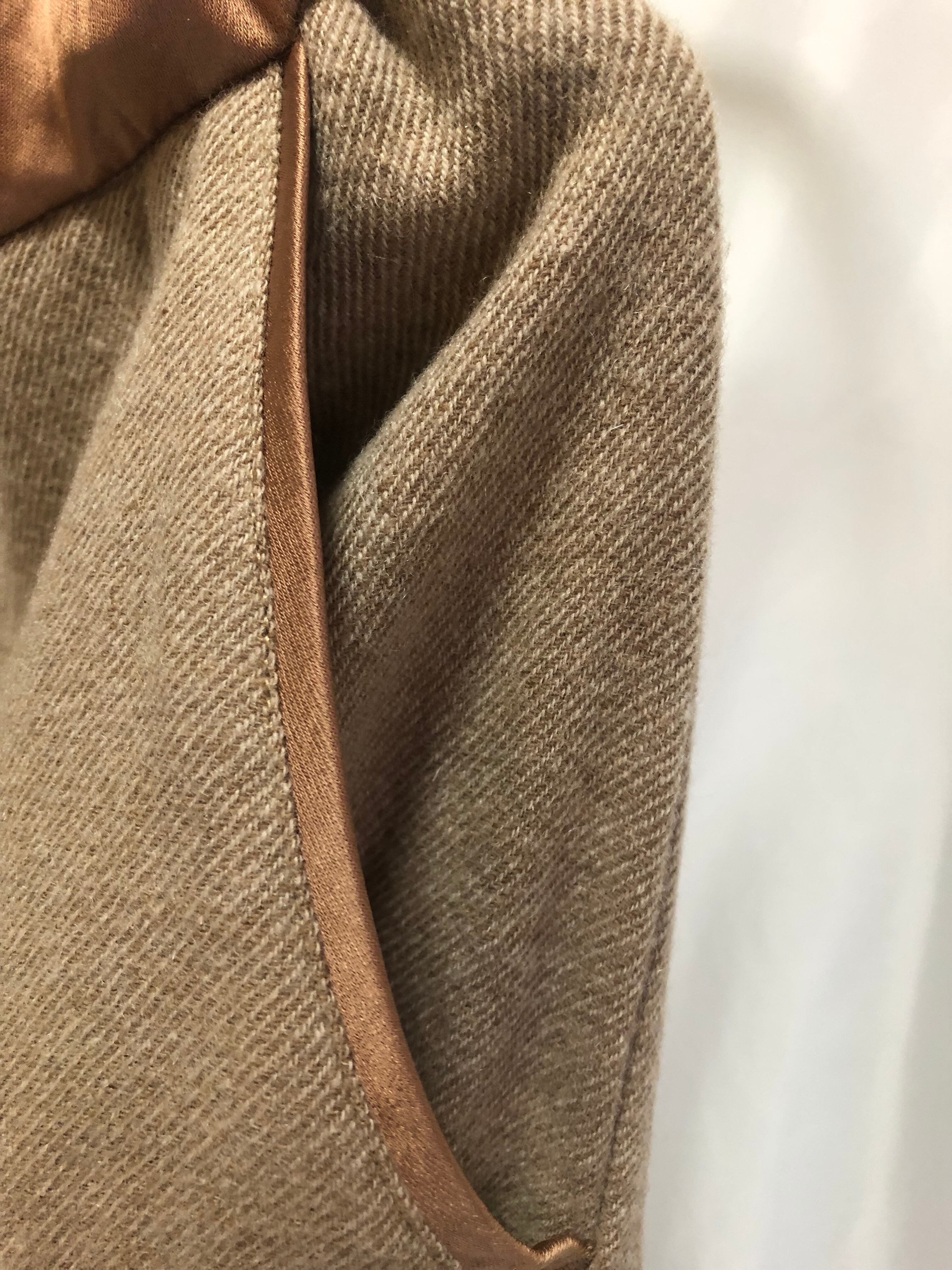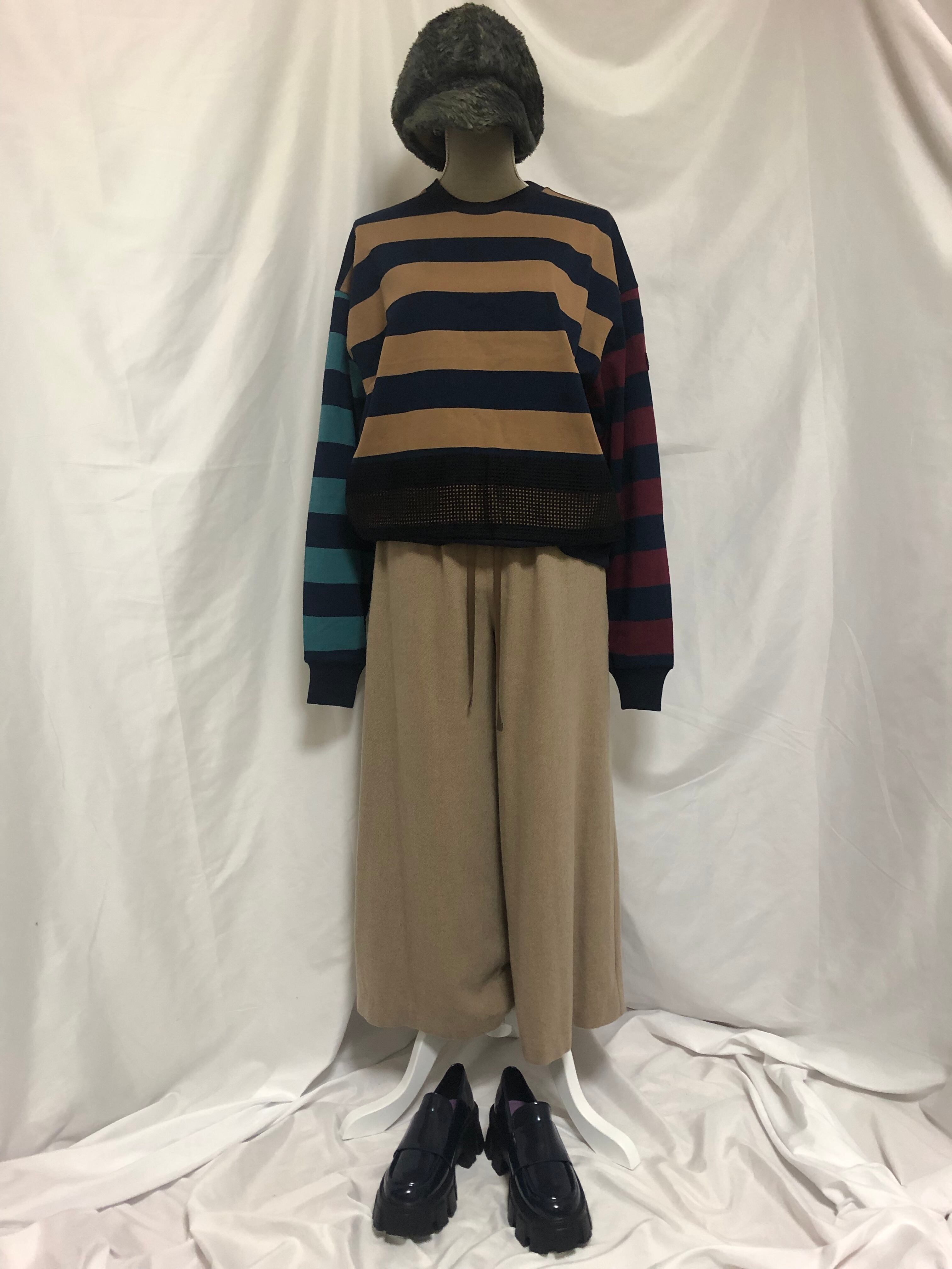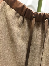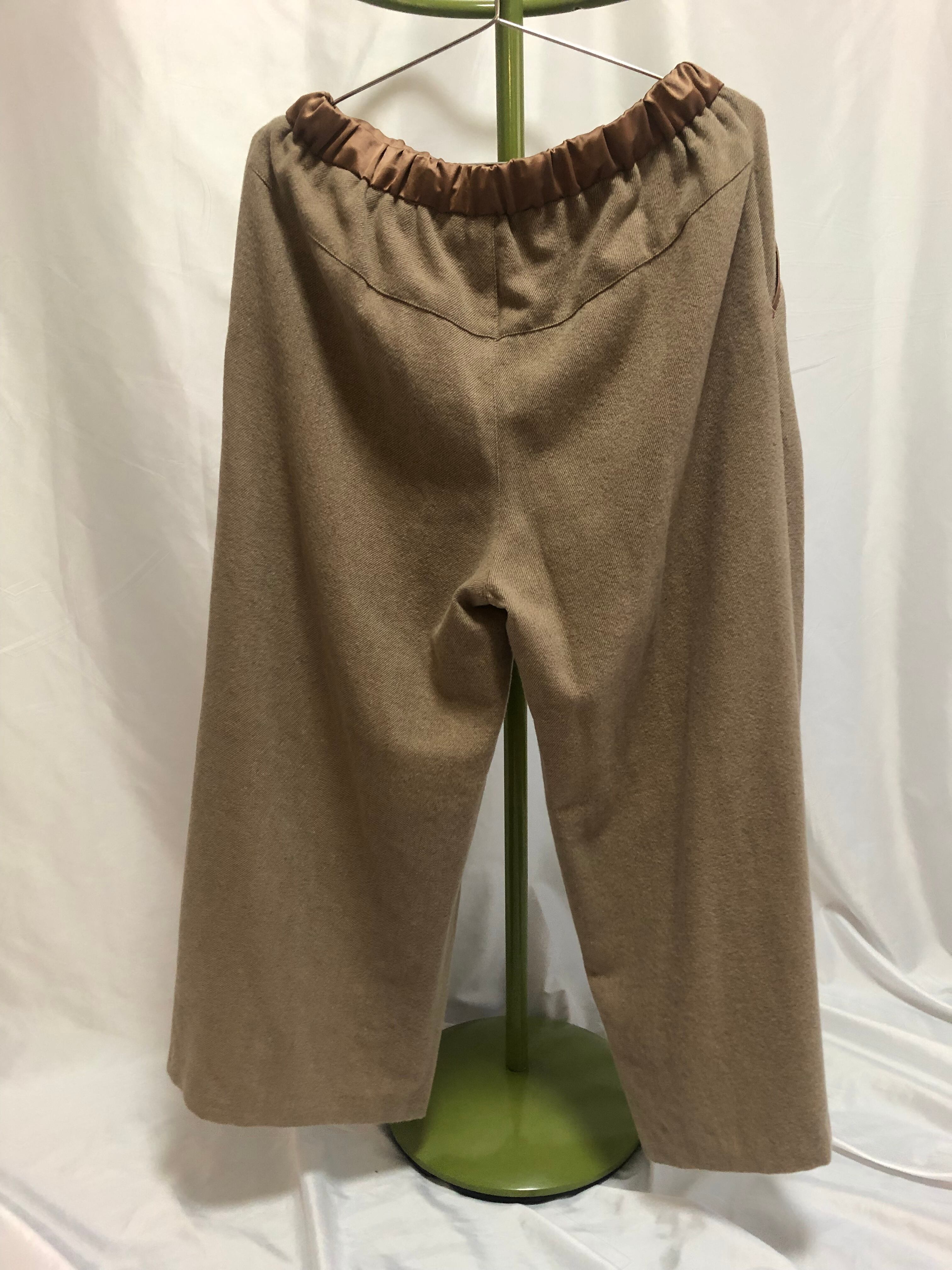 日本製生地使用。ふんわり軽いモヘア混でウール混率の高い生地は暖かく優しいタッチ、綾織りの凹凸が高級感あります。滑らかな肌触りとドレープ感がポイントのワイドパンツは後ろゴム仕様ではきやすさも抜群の1本です。 ショート丈のトップスと相性バツグンです。222389667Hとセットアップ