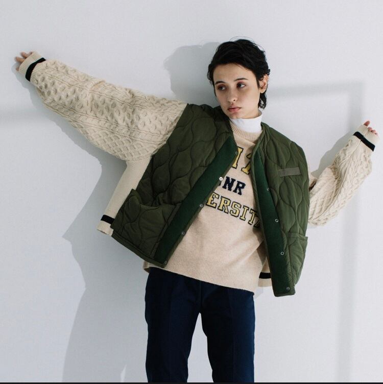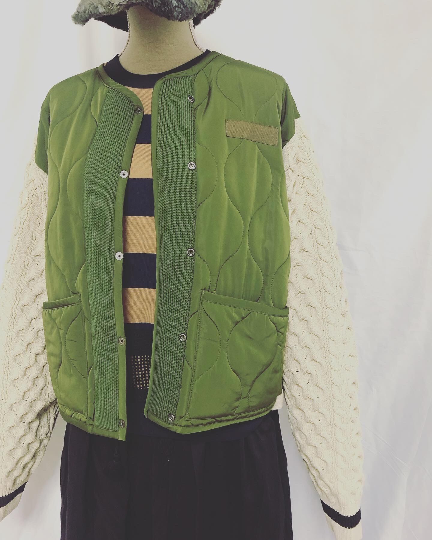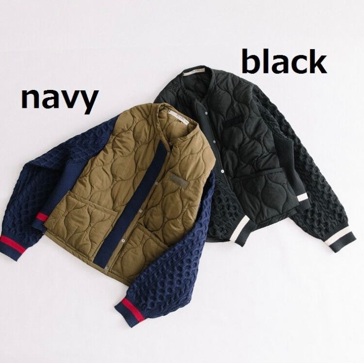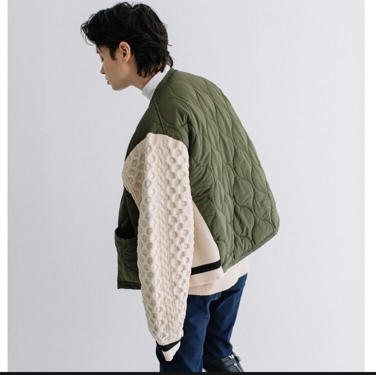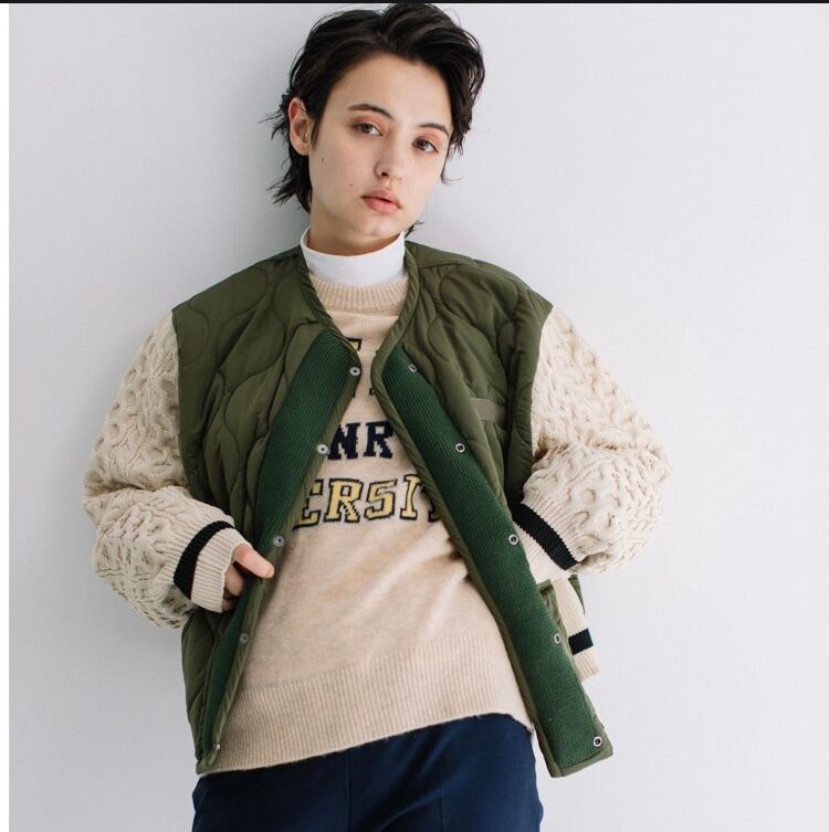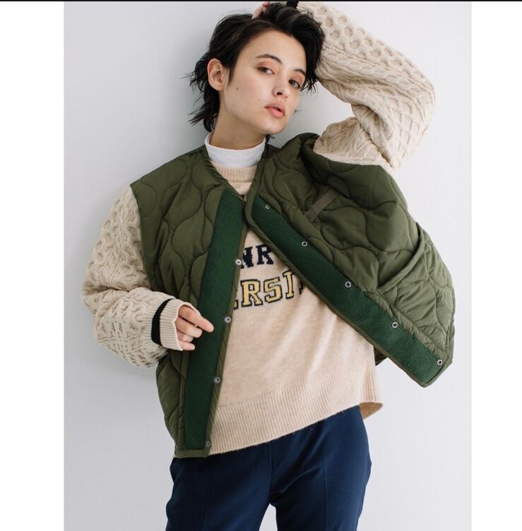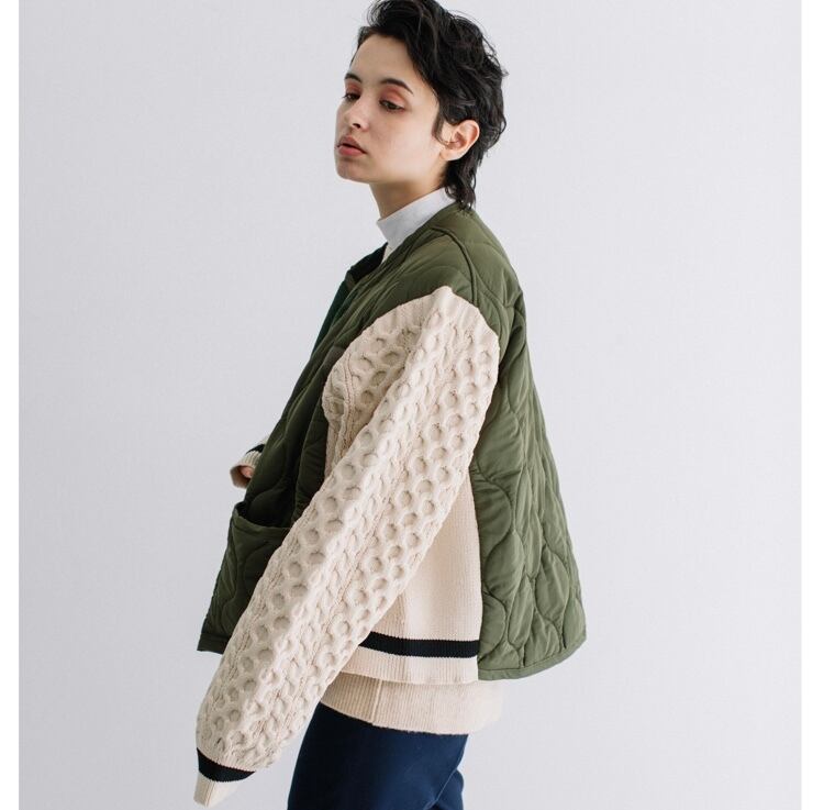 ライトなキルティングに毛羽立ちの少ないマッドなアラン編みニットの袖をドッキングした異素材MIXのライトブルゾン。