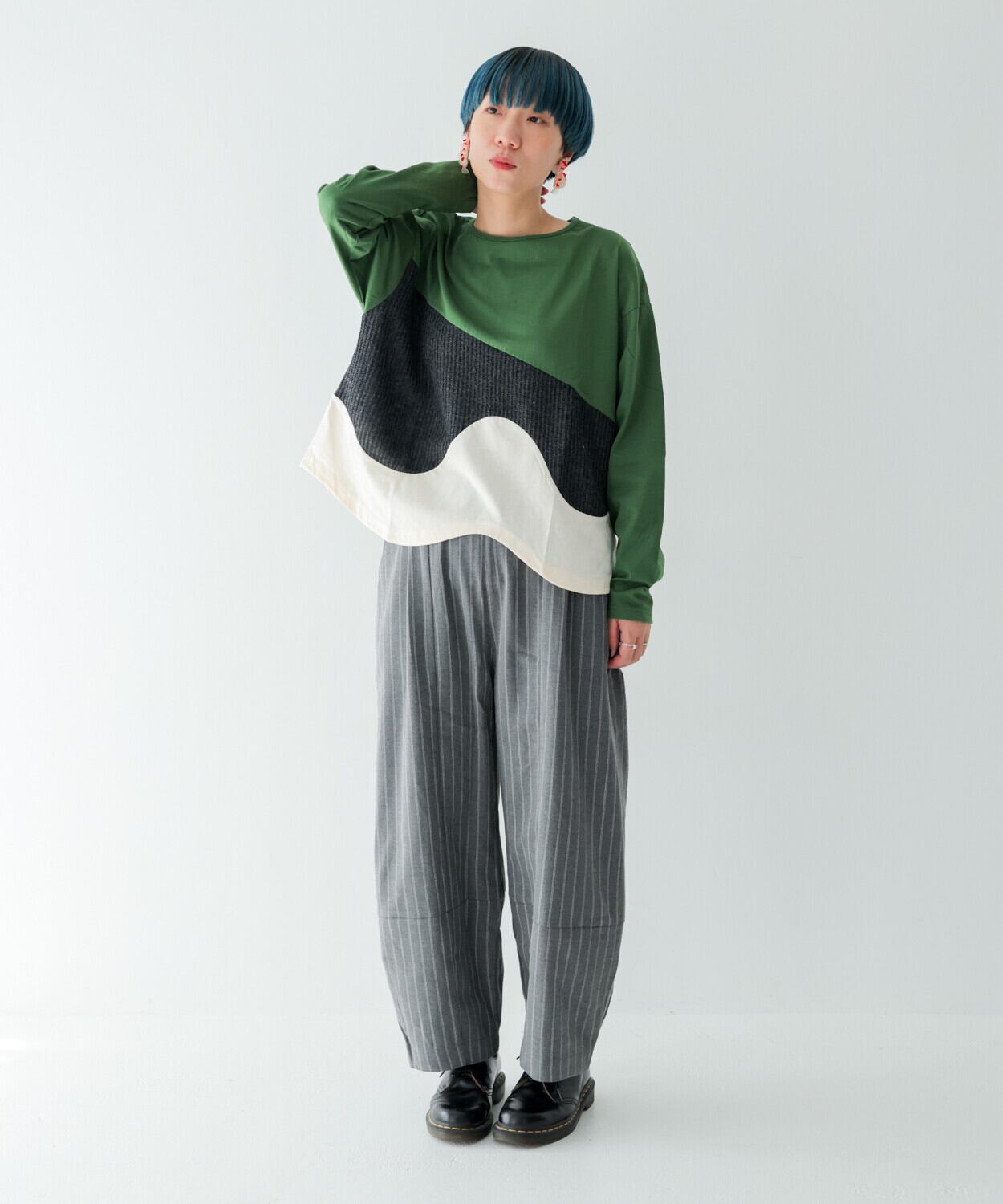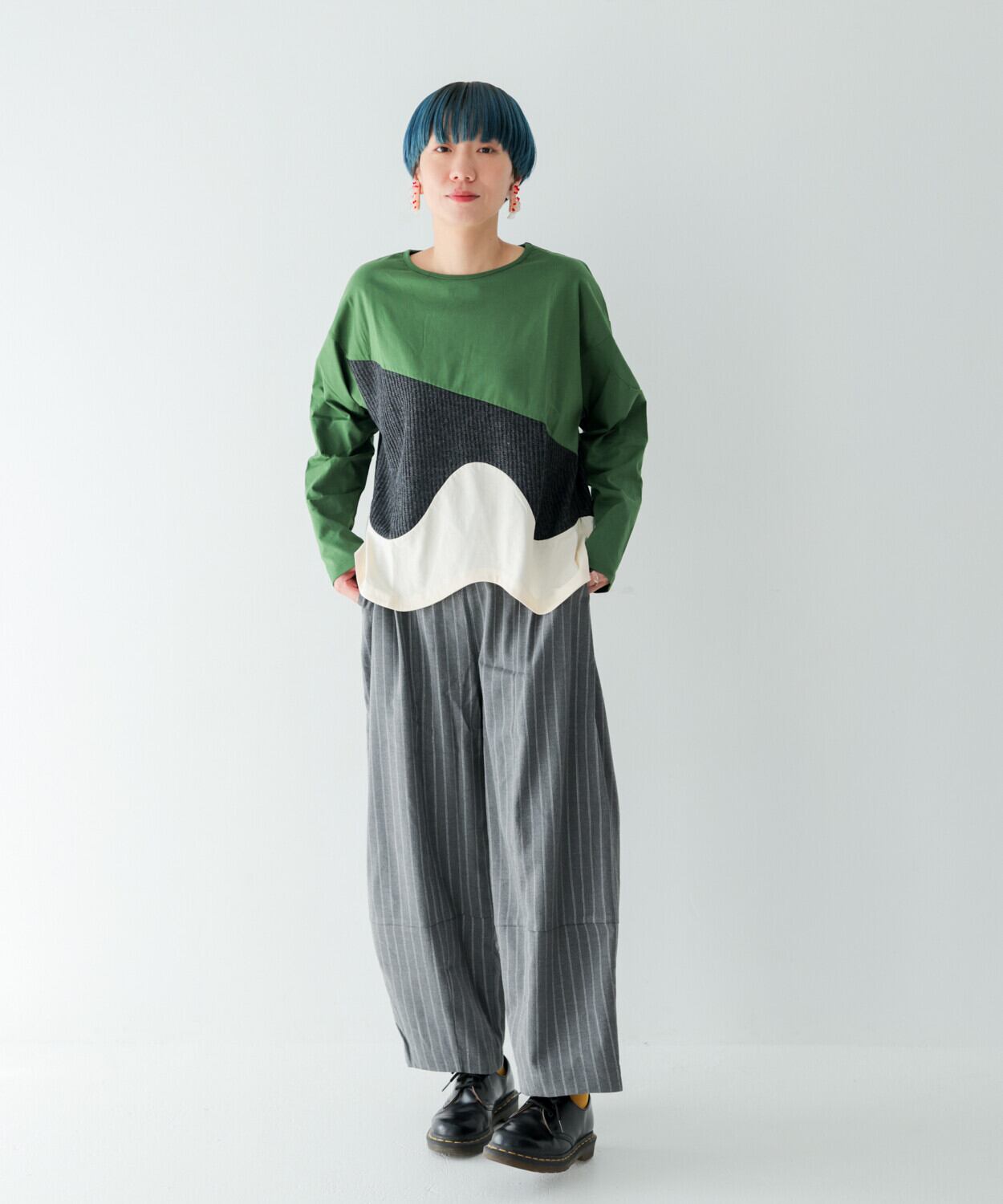 裾にかけてゆるやかに丸みを帯びたラインにすることで、かっちりとしすぎないシルエットになっています。